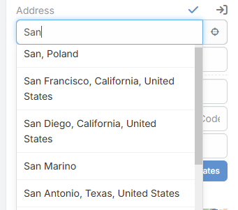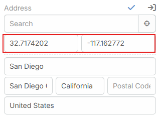- Search Type in the search box and select a Photon result to fill street, city, state, country, postal code, latitude, and longitude.