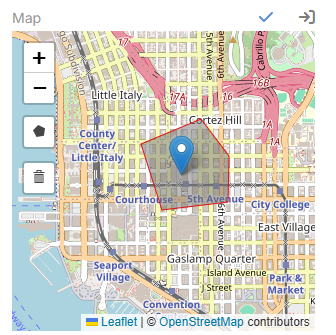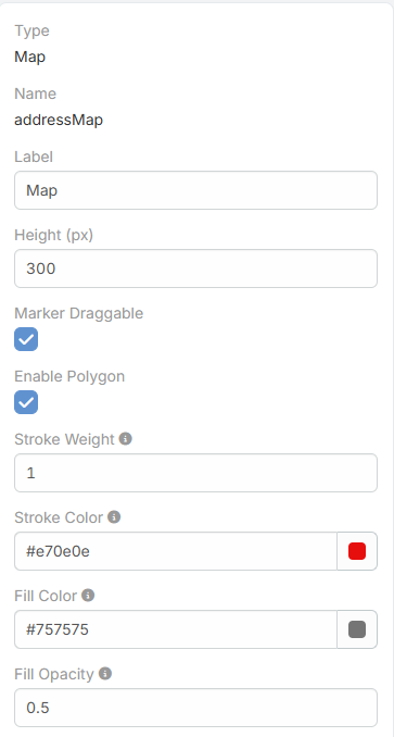 The draggable marker and polygon options are configured on the address field's companion Map field, not on the address field itself.