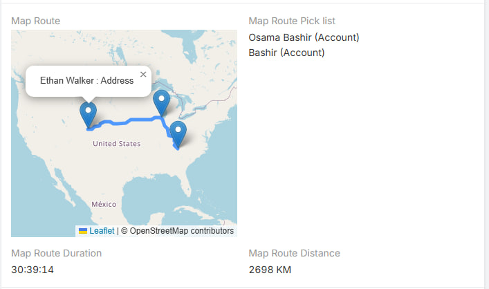 The extension adds a Map Route field type that builds a route from multiple points and stores distance and duration on the record.