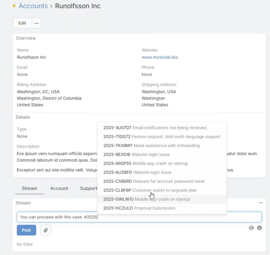 Those references can be tagged into the stream. When a reference number is mentioned in a post (e.g., "Regarding #PRJ-1234"), it is automatically converted into a link to the related record.