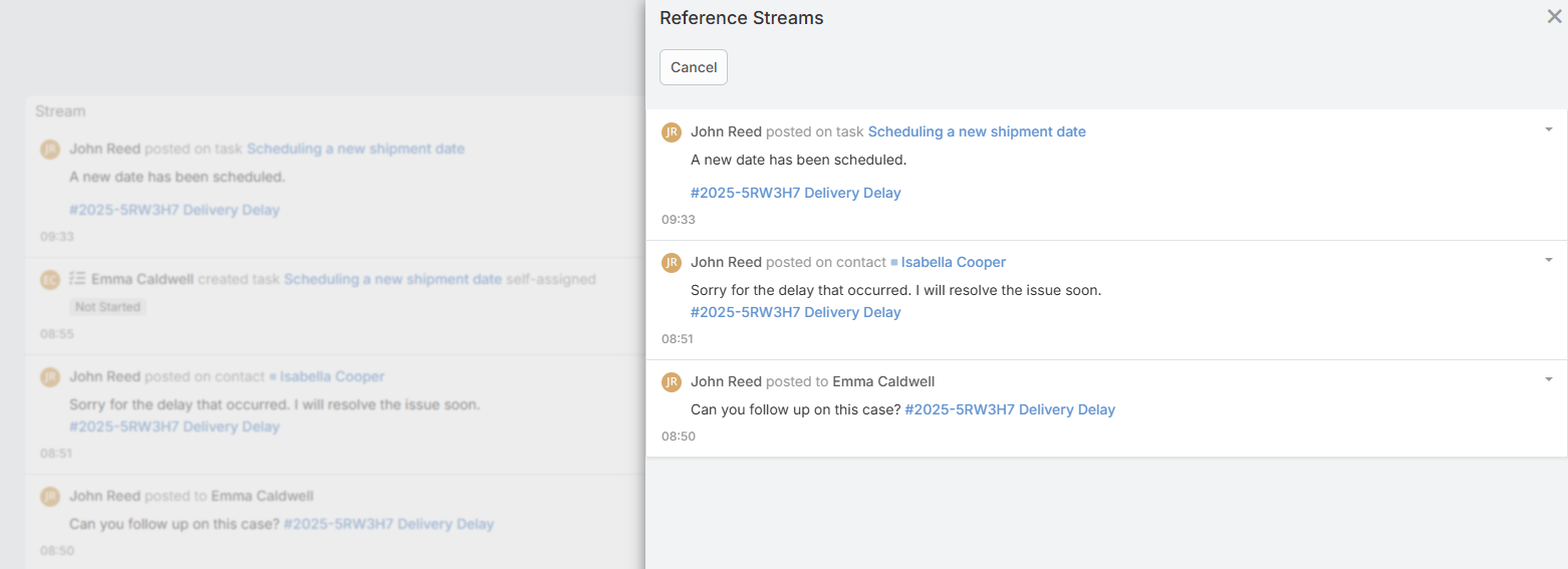 [#REF-1234]) to open a modal showing all stream posts mentioning that reference.