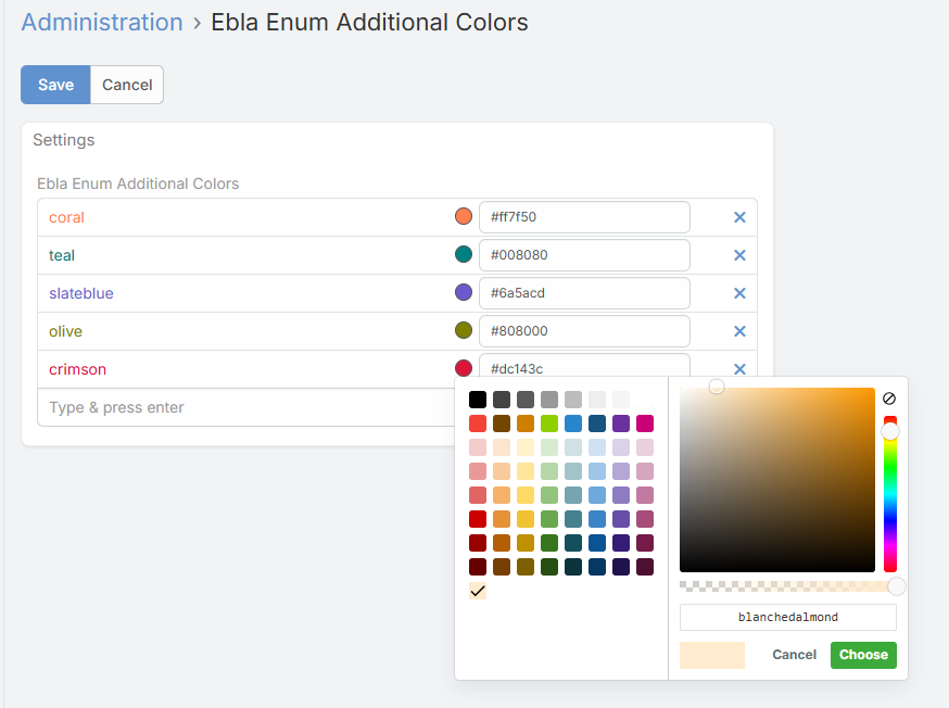 Administration>Ebla Enum Additional Colors. - Functionality: Add custom colors using an intuitive color picker or by manually entering the HEX color code. Each entry represents a reusable color option stored centrally.