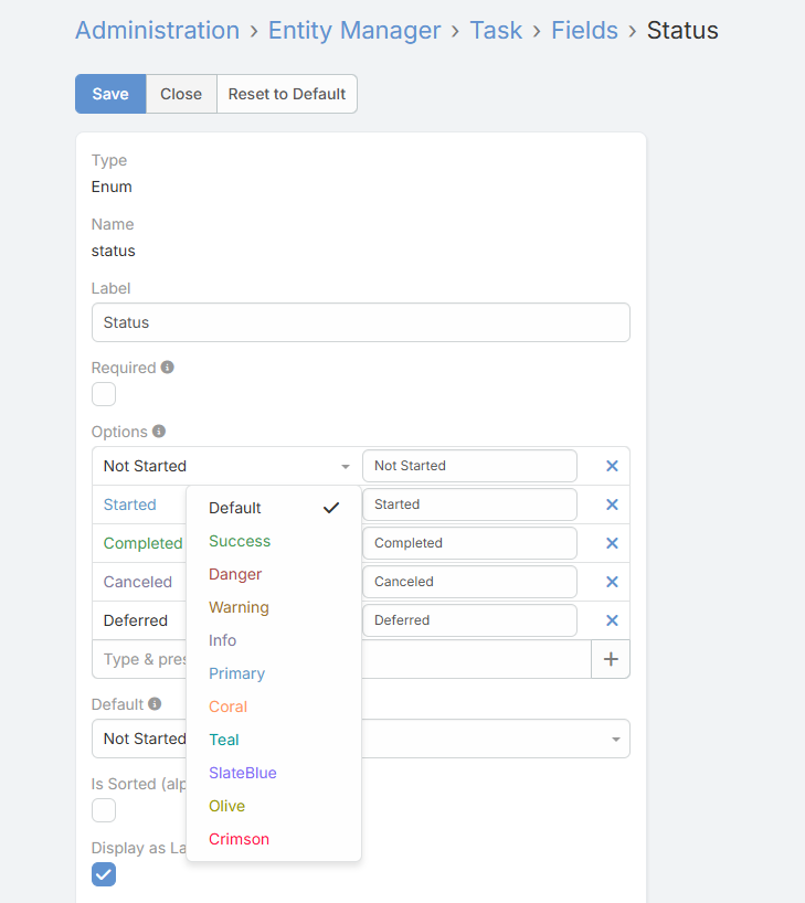 - Integration: The defined colors automatically appear as selectable color options when configuring Enum and Multi-Enum fields.