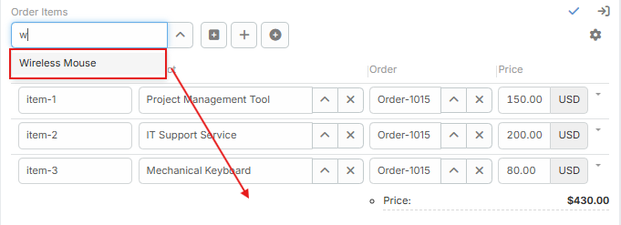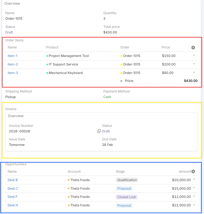 Ebla Link Pro upgrades standard "Link Multiple" and "Link One" fields by rendering them as interactive lists inside the record view. Instead of simple tags, linked records appear in a full grid supporting inline editing, custom layouts, footer calculations, and direct record creation.