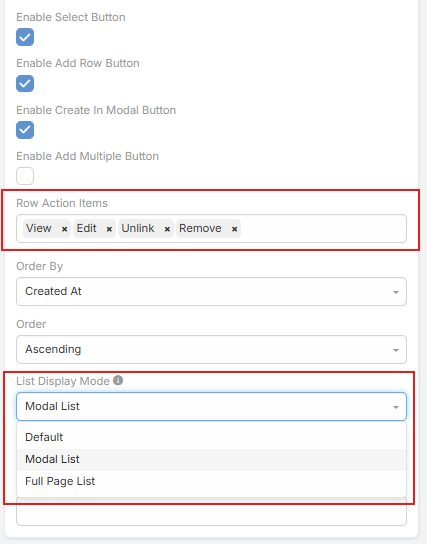 view,edit,unlink,remove) for each row. - List Display Mode: Choose how to display link-multiple fields in list view: