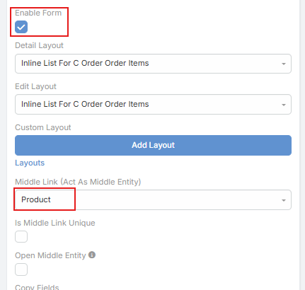 - Many-to-Many: Shows Enable Form, Row Action Items, and both the parent and layout fields.