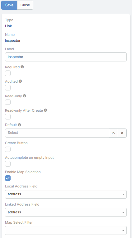 When Enable Map Selection is turned on, the other three parameters become visible in the field editor.