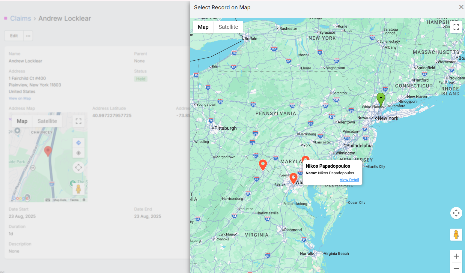 - Clicking a marker opens a detail modal where the user can review the record, select it, or open it in a new tab.