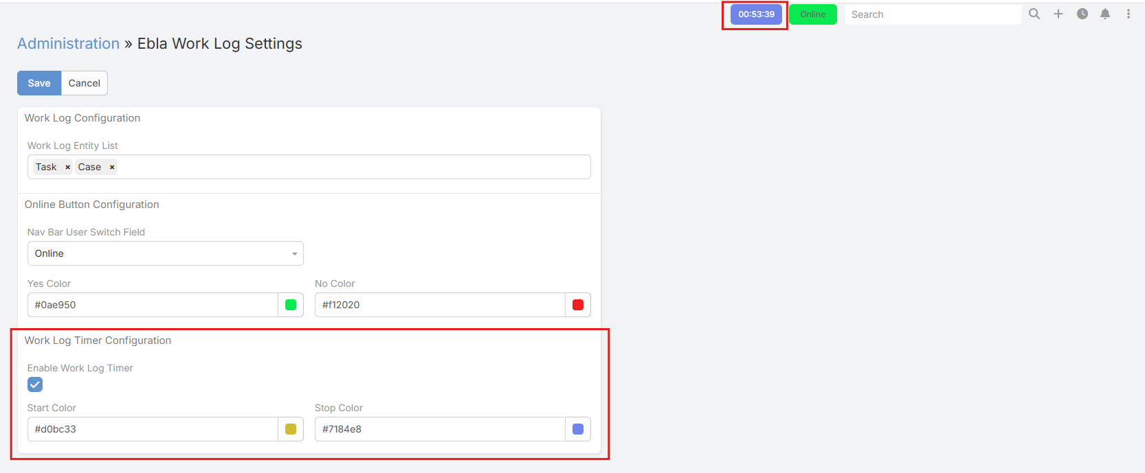 - Mark the entity types that should expose work log controls; the system clears cache automatically after you save.