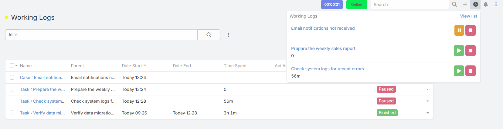 Use the panel to view your active logs, open parent records in a new tab, or pause/stop entries directly.